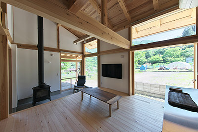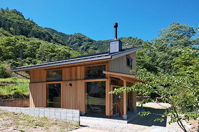 「森の中の小さな家」の影響を受けたこともあって、吹き抜けのリビング空間が中心となった、片流れの屋根が特徴の杉板張りのコンパクトな家です。大きな窓から日差しと周りの風景を取り込んで、明るく開放的に暮らせます。仕事柄、出入りがしやすいようリビングに面した土間をつくってもらい、そこに薪ストーブを設置した点も特徴の一つです。