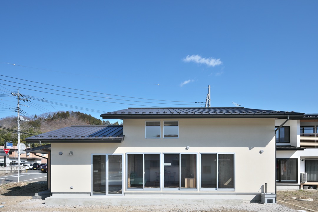 敷地は自然豊かな山々に囲まれた分譲地の一画にあり、道路とほぼ平坦な立地で陽当りの良い場所にあります。1階に個室が2部屋、2階に1部屋、南の陽当りの良い場所に洗濯物干しスペースが欲しいと3つの要望を受けて設計した住まいです。間取りは居間を中心としてどの部屋にも行けるシンプルながらも無駄のない設計で、構造材の仕口には化粧接合金物Dボルトを採用し、継手は木組みの追っかけ大栓継手を採用した金物と木組みの両立をテーマとした家でもあります。