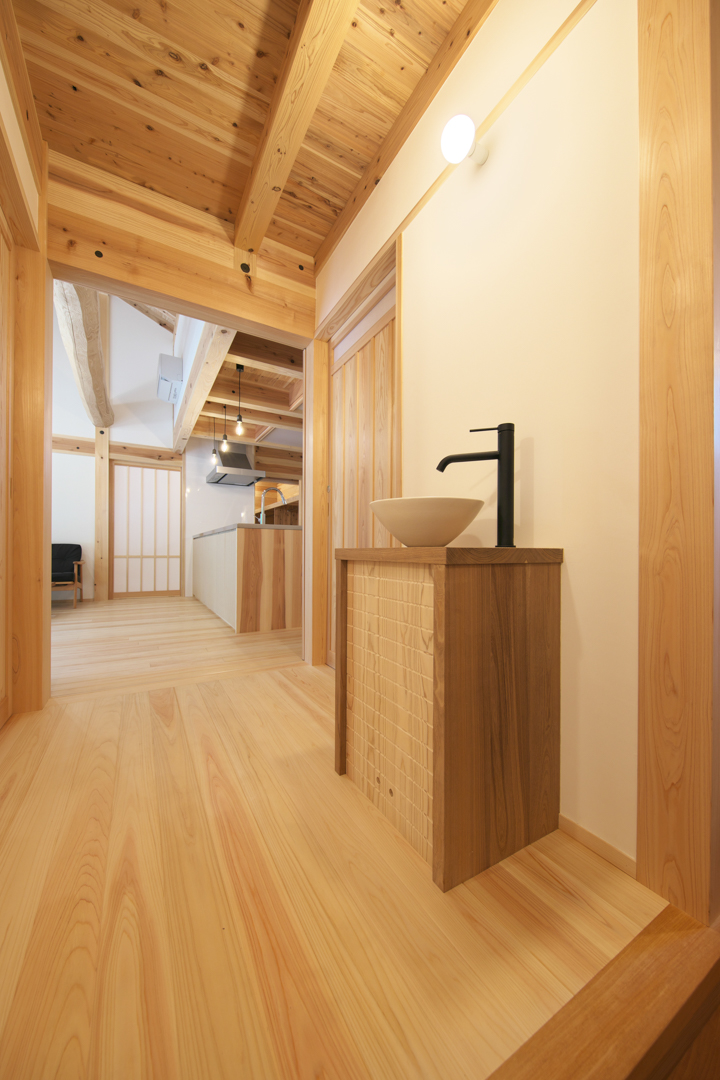 敷地は開拓前の自然木が生い茂る隣地に囲まれた場所で、住まい手さんが考えたレイアウトを基に美しい架構や耐震・温熱環境を整えた木の住まいです。敷地南側の美しい景色を映し出す南開口部を大きくとり四季の移ろいや自然を感じることのできる空間にデザインしました。自然に寄り添いながら薪ストーブの炎を見てくつろぐ時間を大切にする暮らしがここから始まります。