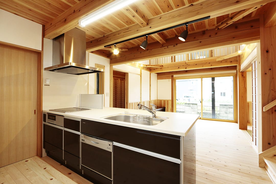 敷地は住宅街の中にあり、南には畑が広がる穏やかな場所です。南の畑に建物が建っても冬の日射が奥まで届くよう居間の上に吹抜を設け、明るい居間になるよう計画しました。居間に隣接する和室の南の縁側は、奥にある親世帯寝室と居間につづく廊下になっており、親世帯寝室、居間、北側の廊下と回れる計画としています。また、大屋根には太陽光パネルを搭載し、創エネと省エネを兼ね備えた家となりました。