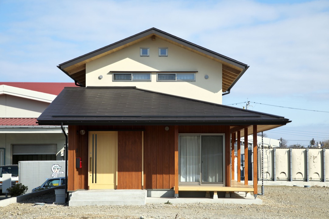 敷地は下仁田IC付近の平坦な土地で、南の山際には梅雨時期になるとアジサイの花が綺麗に咲く日当たりの良い立地です。約149坪の土地には1階ですべてが完結するよう平屋ベースの家事動線を考えた間取りを計画しました。1階のダイニングキッチンと和室、2階の主寝室と子ども室を総2階部分とし、その西側に居間と玄関、東側に室内物干し場、脱衣室、お風呂を下屋として配置したシンプルなプランです。玄関ホールからパントリー、そしてキッチンへの動線が買い物を運ぶ際に便利で、キッチンを中心に回れる間取りとしました。東南西と建物廻りに併設したウッドデッキが室内と室外を柔らかく繋いでくれます。